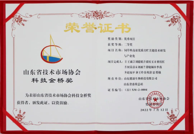 2022年8月11日,2022年度山東省科技金橋獎(jiǎng)表彰獎(jiǎng)勵(lì)大會(huì)暨泰山科技論壇在淄博高青舉行。會(huì)議現(xiàn)場(chǎng)為項(xiàng)目頒獎(jiǎng),經(jīng)過(guò)專業(yè)組評(píng)審、評(píng)審委員會(huì)評(píng)審、獎(jiǎng)勵(lì)委員會(huì)終審,決定授予山東健源生物科技有限公司項(xiàng)目為山東省科技金橋獎(jiǎng)項(xiàng)目二等獎(jiǎng),山東健源生物王誠(chéng)董事長(zhǎng)作為項(xiàng)目完成人上臺(tái)領(lǐng)獎(jiǎng)。