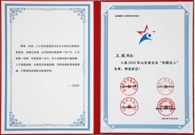 祝賀山東健源生物董事長(zhǎng)王誠(chéng)榮獲2022年山東省企業(yè)“創(chuàng)新達(dá)人”稱號(hào)