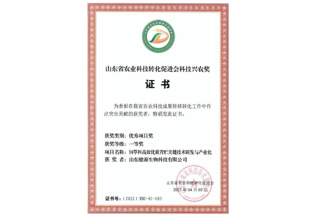 山東健源生物榮獲山東省農業(yè)科技轉化促進會科技興農獎一等獎