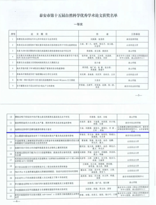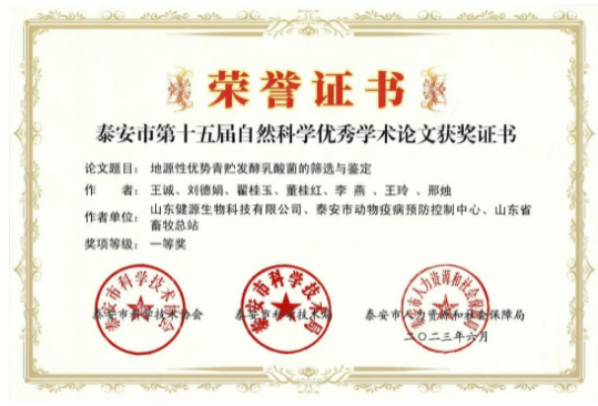 山東健源生物榮獲泰安市第十五屆自然科學優(yōu)秀學術論文一等獎
