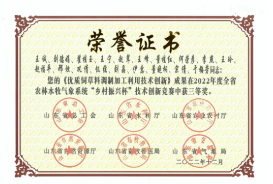 近日,由山東省總工會牽頭,山東省水利廳、山東省農業(yè)農村廳、山東省自然資源廳、山東省畜牧獸醫(yī)局、山東省氣象局組織的2022 年度全省農林水牧氣象系統(tǒng) “鄉(xiāng)村振興杯”和“建設綠色安瀾黃河” 工作創(chuàng)新技術創(chuàng)新競賽獲獎成果進行了公布。山東健源生物科技有限公司《優(yōu)質飼草料調制加工利用技術創(chuàng)新》成果榮獲2022年度全省農林水牧氣象系統(tǒng)“鄉(xiāng)村振興杯”技術創(chuàng)新競賽三等獎。