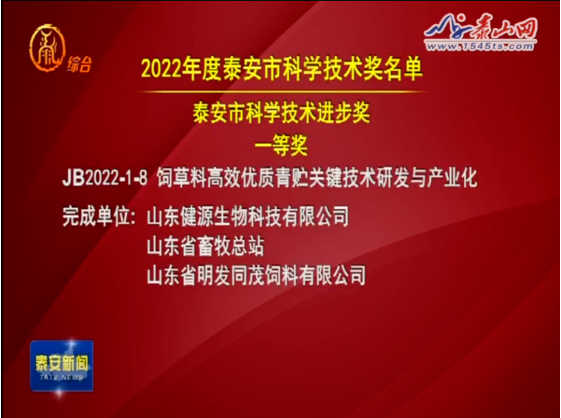 會議宣讀了泰安市人民政府《關(guān)于2022年度科學(xué)技術(shù)獎勵的決定》和《關(guān)于下達2023年泰安市科技創(chuàng)新“雙十工程”項目的通知》,并為2022年度科學(xué)技術(shù)獎獲獎代表頒獎。山東健源生物科技有限公司《飼草料高效優(yōu)質(zhì)青貯關(guān)鍵技術(shù)研發(fā)與產(chǎn)業(yè)化》項目榮獲泰安市科學(xué)技術(shù)進步獎一等獎。