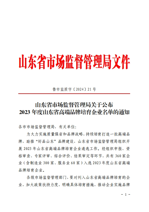 發(fā)布時(shí)間:[2024-2-4 8:44:32] 瀏覽量:3352次山東省市場(chǎng)監(jiān)督管理局主持開展的山東省高端品牌培育企業(yè)評(píng)選工作是培育質(zhì)量高、效益高、誠信度高、美譽(yù)度高的山東企業(yè)品牌,是深入實(shí)施質(zhì)量強(qiáng)省及品牌戰(zhàn)略,共建共享“好品山東”,加快推進(jìn)山東省品牌高端化進(jìn)程的一項(xiàng)重要工作。經(jīng)組織申報(bào)、資格審查、專家評(píng)審、綜合評(píng)價(jià)、結(jié)果審定等環(huán)節(jié),共有360家企業(yè)(含制造業(yè)300家、服務(wù)業(yè)60家)入選2023年度山東省高端品牌培育企業(yè)。