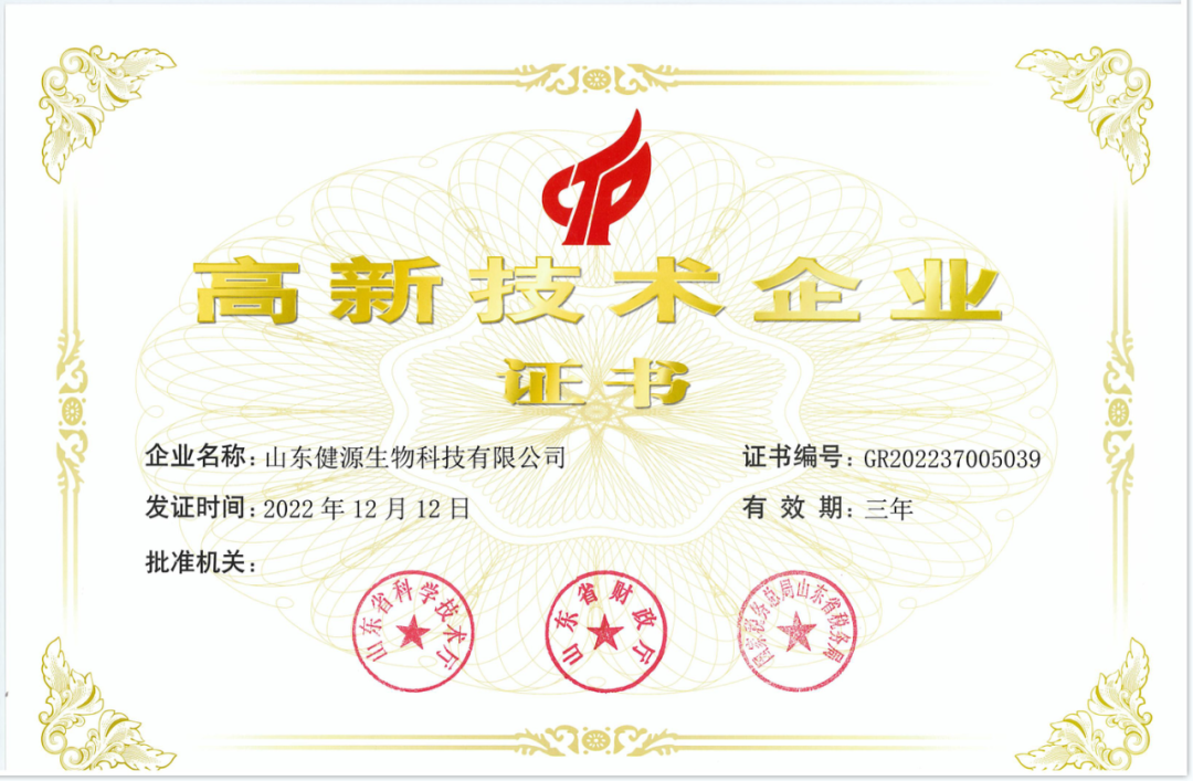 2022年12月,山東健源生物科技有限公司再次通過2022年度國家高新技術(shù)企業(yè)認(rèn)定,有效期三年。
