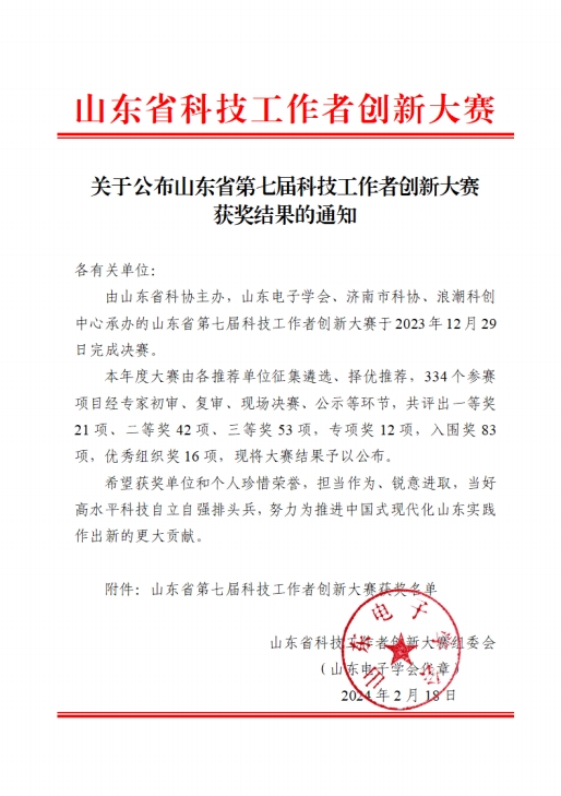 由山東省科協(xié)主辦,山東電子學(xué)會、濟(jì)南市科協(xié)、浪潮科創(chuàng)中心承辦的山東省第七屆科技工作者創(chuàng)新大賽于2023年12月29日完成決賽。本年度大賽由各市科協(xié)、省級學(xué)會、高?茀f(xié)、院士工作站等征集遴選、擇優(yōu)推薦的334項參賽項目,經(jīng)專家初審、復(fù)審、現(xiàn)場決賽、公示等環(huán)節(jié),共評出一等獎21項,二等獎42項,三等獎53項,專項獎12項,入圍獎83項,優(yōu)秀組織獎16項。