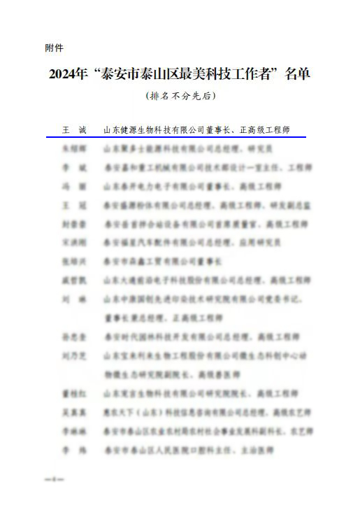 4月18日,泰安市泰山區(qū)區(qū)委宣傳部、區(qū)科協(xié)、區(qū)教體局、區(qū)科技局、區(qū)工信局、區(qū)農(nóng)業(yè)農(nóng)村局、區(qū)衛(wèi)健局聯(lián)合下發(fā)《關于公布2024年“泰安市泰山區(qū)最美科技工作者”的通知》,山東健源生物科技有限公司董事長王誠榮獲2024年“泰安市泰山區(qū)最美科技工作者”榮譽稱號。