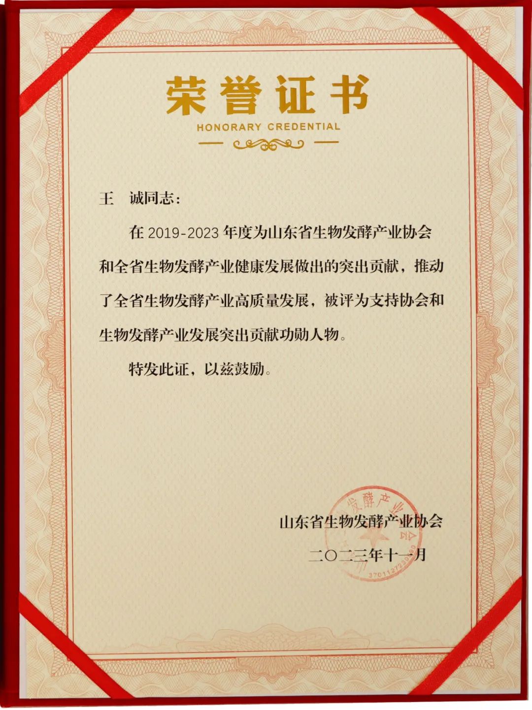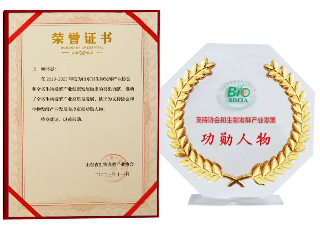 董事長(zhǎng)王誠(chéng)被評(píng)為支持協(xié)會(huì)和生物發(fā)酵產(chǎn)業(yè)發(fā)展突出貢獻(xiàn)功勛人物