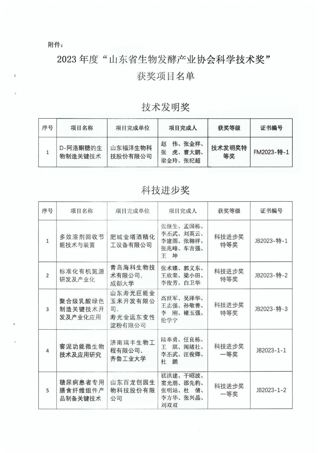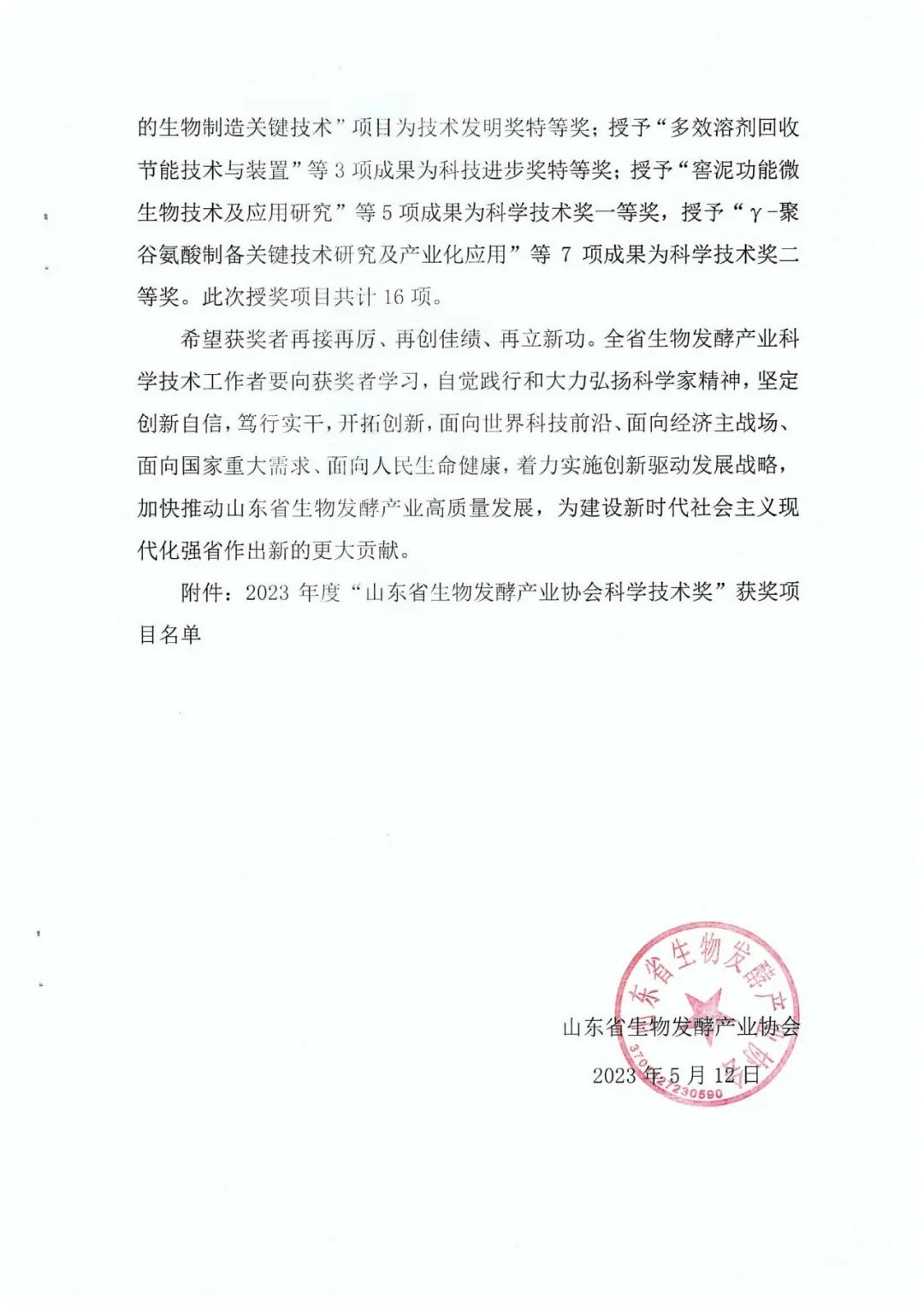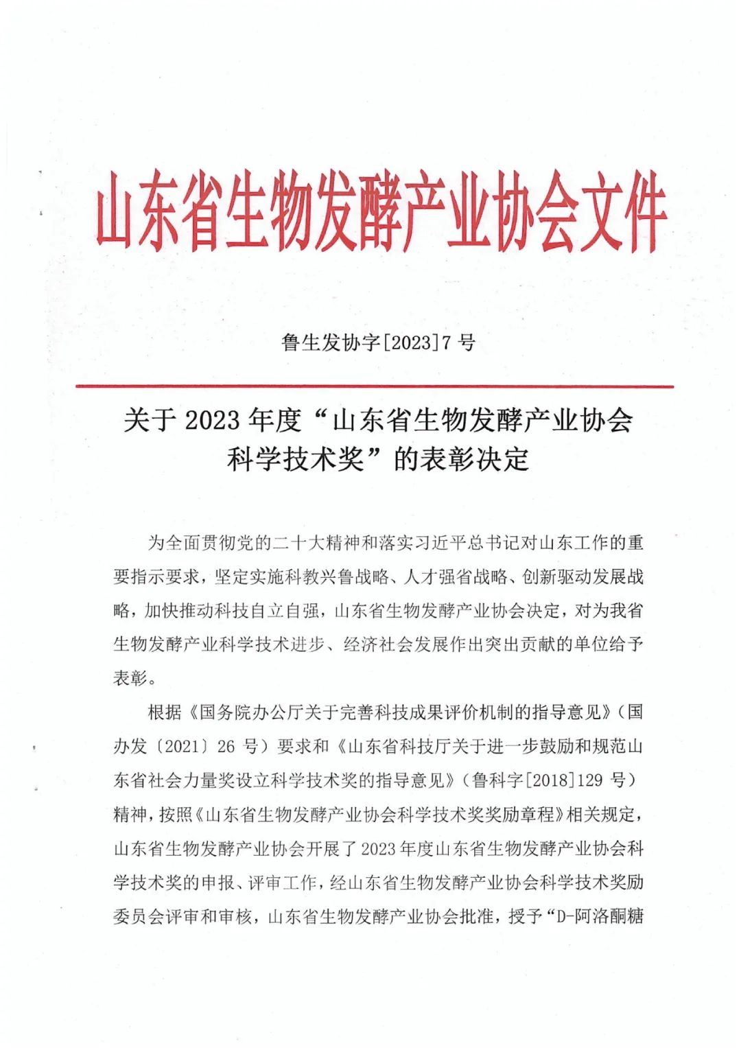 山東省生物發(fā)酵產(chǎn)業(yè)協(xié)會(huì)科學(xué)技術(shù)獎(jiǎng)