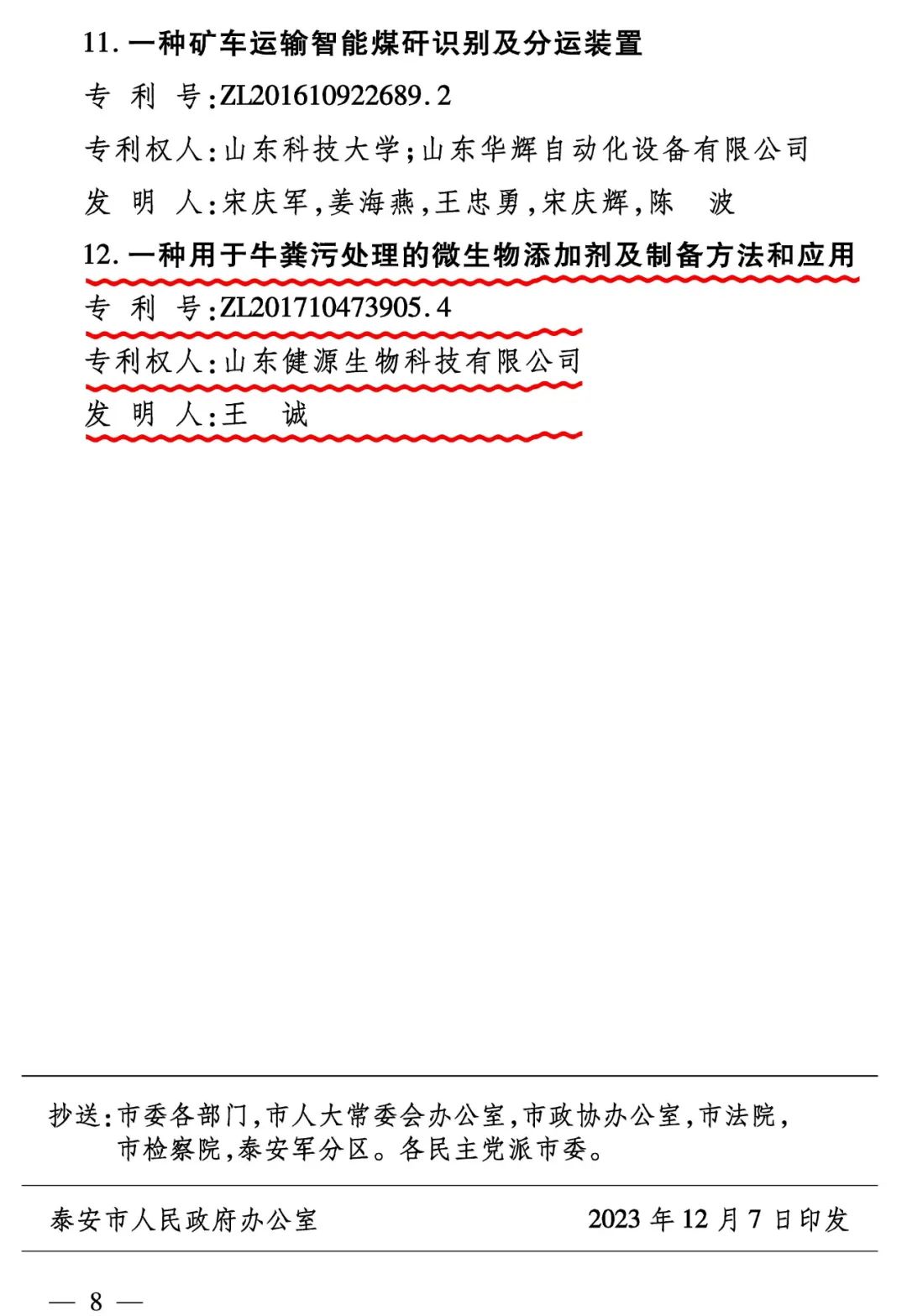12月7日,泰安市人民政府發(fā)布關(guān)于2022年度泰安市專利獎(jiǎng)勵(lì)的決定(泰政字【2023】74號(hào)),山東健源生物科技有限公司的“一種用于牛糞污處理的微生物添加劑及制備方法和應(yīng)用”獲全市專利三等獎(jiǎng)。