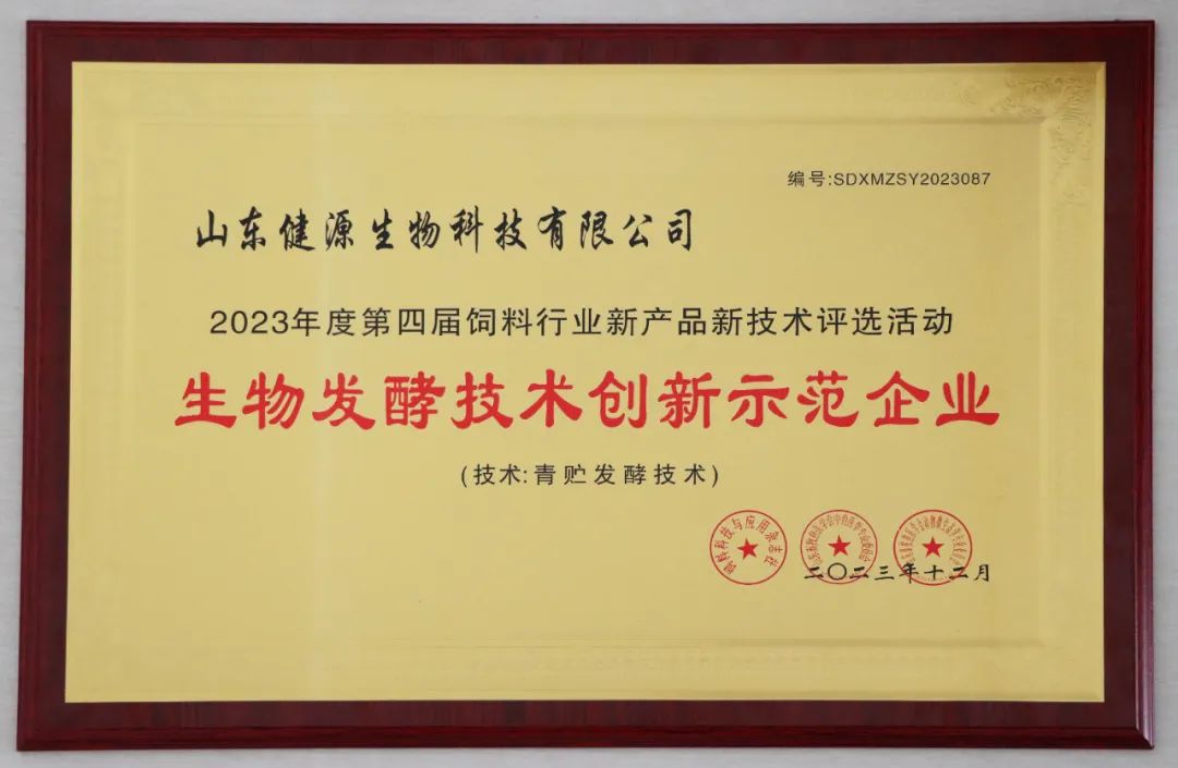 12月12日,由山東畜牧醫(yī)學(xué)會主辦的第四屆青鳥論壇暨2023年度飼料行業(yè)新產(chǎn)品新技術(shù)研討發(fā)布會在濟(jì)南舉行。山東健源生物科技有限公司獲評生物發(fā)酵技術(shù)創(chuàng)新示范企業(yè)。