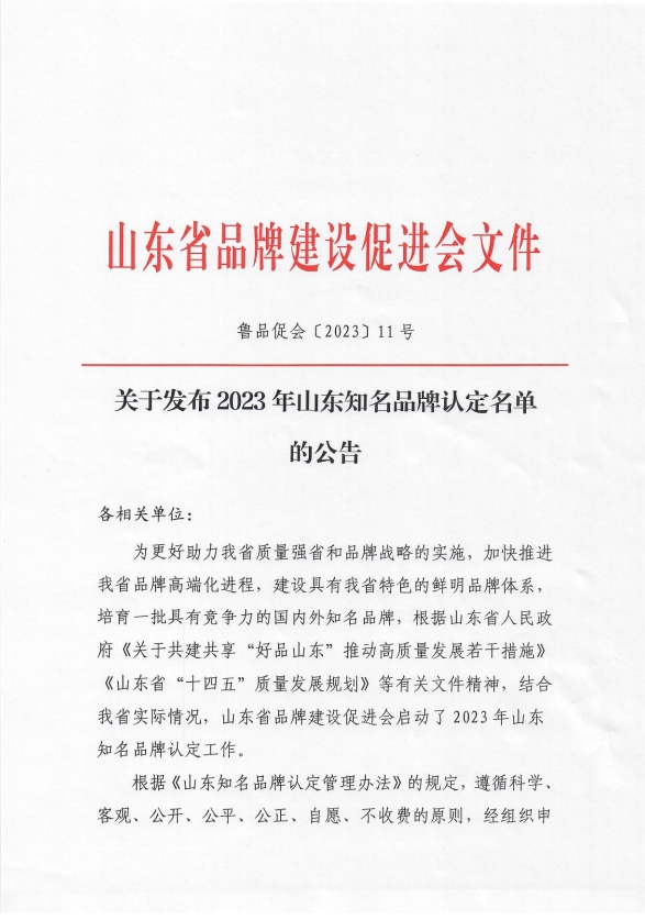“山東知名品牌”認(rèn)定,是根據(jù)山東省人民政府《關(guān)于共建共享“好品山東”推動(dòng)高質(zhì)量發(fā)展若干措施》《山東省“十四五”質(zhì)量發(fā)展規(guī)劃》等有關(guān)文件精神,結(jié)合我省實(shí)際情況,山東省品牌建設(shè)促進(jìn)會(huì)啟動(dòng)實(shí)施2023年山東知名品牌認(rèn)定工作。根據(jù)《山東知名品牌認(rèn)定管理辦法》的定,遵循科學(xué)、客觀、公開、公平、公正、自愿、不收費(fèi)的原則,經(jīng)組織申報(bào)、資格審查、大數(shù)據(jù)信息挖掘、信息化系統(tǒng)平臺(tái)評(píng)審、專家評(píng)審、認(rèn)定專家委員會(huì)審議、認(rèn)定文員會(huì)認(rèn)定等工作程序,認(rèn)定了409個(gè)產(chǎn)品項(xiàng)目,84個(gè)服務(wù)項(xiàng)目,獲得2023年山東知名品牌認(rèn)定資格。